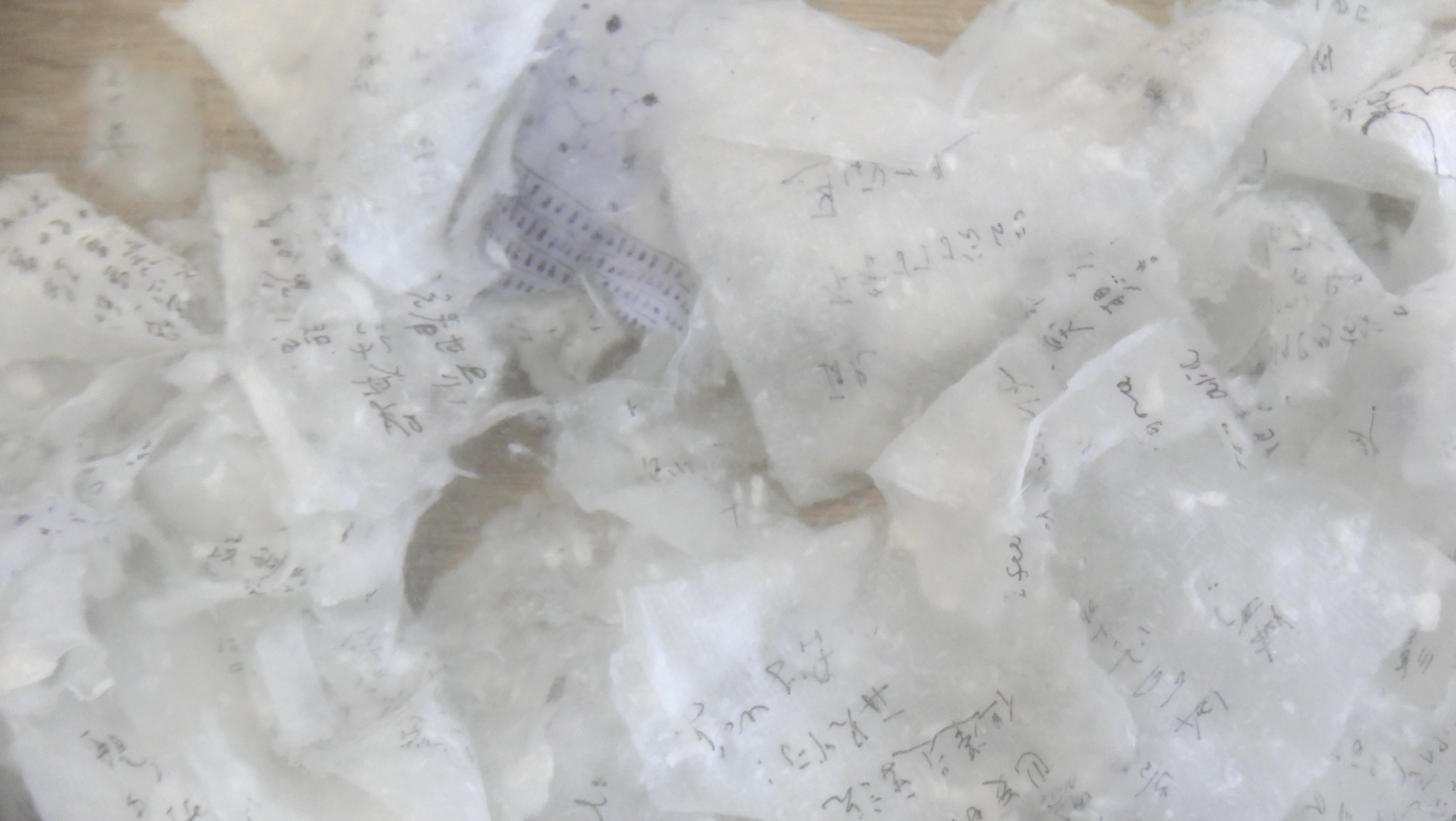 Chen-Yu Wang seeks to redefine the relationship between body and materials, people and environments. In the process of behavioral display and development, Wang looks to expand possibilities of materials as well as to deconstruct memories of cultural and social structures left by past experiences on our bodies. In the process of practice, Wang saw dissolution and reproduction in paper-making; she combed through hidden memories in writing. Maybe at the end, pains or secrets left by the past would still be there, but time continues to flow objectively. In this confusing and hard-to-define era, this work invites all viewers to participate int he collective action of bidding farewell. They will see each other under anonymous messages, which will be further processed by the artist after the exhibition.